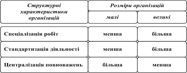 Розміри організації. Вчені Астонського університету з Бірмінгему вивчали широке коло організацій з метою визначення впливу технології та розмірів фірми на її структуру. За результатами своїх досліджень вони прийшли до таких висновків: 1. Технологія чинила сильний вплив на структурні характеристики тільки в малих фірмах. 2. У великих фірмах тісний зв’язок між технологією та структурою зникає. Сильний вплив на структуру у цьому випадку чинили розміри організації. Ключові аспекти впливу розміру організації на її структуру наведені на табл. 6. 4. Таблиця 6.4 Вплив розміру організації на її організаційну структуру