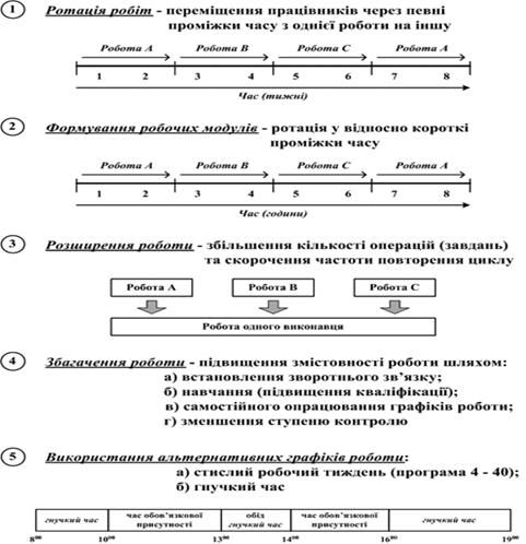 2) Формування робочих модулів – ротація у відносно короткі проміжки часу, наприклад, впродовж одного робочого дня. 3) Розширення роботи - горизонтальне розширення роботи за рахунок збільшення кількості операцій та скорочення частоти повторення циклу роботи. 4) Збагачення роботи - процес підвищення змістовності роботи. Збагачення роботи здійснюється шляхом: