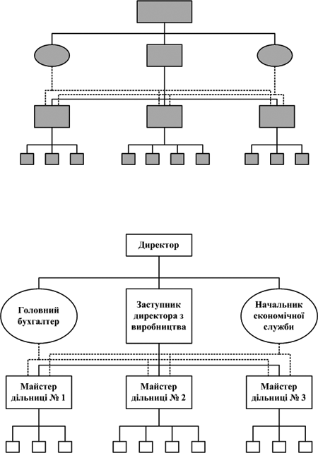 Рис. 6.10. Схема лінійно-функціональної організаційної структури Переваги лінійно-функціональної структури - поєднання переваг лінійних та функціональних структур. Недоліки: