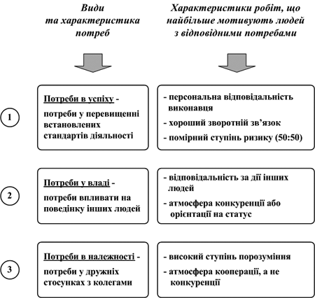 Теорія потреб Девіда МакКлеланда пропонує інші три види потреб (рис. 7. 4): 1. потреби в успіху (досягненнях), тобто потреби в перевищенні встановлених стандартів діяльності, в усвідомленні особистих досягнень (не у винагородженні таких досягнень). Люди з такою потребою намагаються виконати свою роботу краще, якісніше, ефективніше, ніж це було зроблено до них; 2. потреби у владі, тобто потреби впливати на поведінку інших людей, бути впливовим, “мати вагу”; 3. потреби в належності, тобто потреби в дружніх, товариських міжособових стосунках з колегами по роботі.