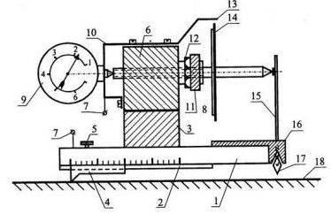 Рис. 19. Кинематическая схема электромеханического тензометра: 1 - основание тензометра; 2 - направляющая; 3 - нижняя база тензометра; 4 - опорный нож; 5 - винт фиксирующий; 6 - верхняя база тензометра; 7 - электрические клеммы; 8 - микрометрический винт; 9 - счетчик оборотов лимба; 10 - система крепления счетчика; 11 - муфта микрометрического винта; 12 - натяжная гайка; 13-указатель отсчетов; 14 - лимб; 15-перо; 16-вилка; 17-подвижная призма; 18 - испытываемая конструкция