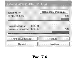 Если поставить флажок Создать SFX-архив, то будет создан самораскрывающийся архив. В окне Метод сжатия можно выбрать один из шести режимов сжатия. В большинстве случаев используется Обычный. Если выбрать Хороший или Максимальный, то возрастет время архивирования. Можно создать многотомный архив. Для этого необходимо в окне Разделить на тома размером (в байтах) указать размер файла: либо стандартный (1 457 664 байт), что соответствует размеру дискеты 3,5”, либо какой-то другой. По завершении установки параметров архива необходимо нажать кнопку ОК. В течение архивирования на экране будет показано окно, которое отображает процесс процедуры (рис. 7.4).