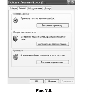 Служебная программа Проверка диска Время от времени в файловой системе могут происходить ошибки, в результате чего возможны потери драгоценных данных. Ошибки в файловой системе включают: • Пересечение файлов – двум файлам распределен один и тот же кластер; в результате оба файла становятся испорченными. • Порча имен файлов, в результате чего имена файлов становятся недостоверными, а это делает невозможным открытие таких файлов. • С течением времени ошибки могут появляться также на физической поверхности самого диска. Регулярные проверки поверхности диска позволяют обнаруживать эти поврежденные области и отмечать их как «плохие», с тем чтобы больше не использовать их для хранения информации. Windows имеет встроенную программу, которая предназначена для контроля файловой системы и дисководов. Чтобы запустить данную программу, необходимо войти в Проводник и выбрать дискету или жесткий диск для проверки. Затем в контекстном меню выбрать команду Свойства и выбрать вкладку Сервис – откроется окно (рис. 7.8). Далее выбрать Выполнить проверку. При этом откроется окно Проверка диска (рис. 7.9). В этомокне необходимо установить Параметры проверки диска и запустить программу. После запуска программы необходимо выполнить все инструкции, предписываемые программой.