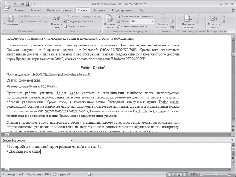 Просмотреть текст сноски можно, подведя курсор к значку ссылки (текст отобразится в виде экранной подсказки) (рис. 7.4). Всплывающая подсказка при наведении указателя мыши на сноску появляется также и в режиме Разметка страницы. Чтобы в режиме Черновик исправить текст сноски, дважды щелкните на значке ссылки – откроется область сносок. Вы также можете перейти в режим Разметка страницы для редактирования текста сноски.