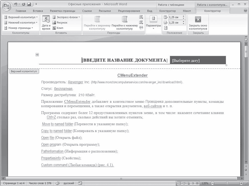 На ленте появится вкладка Работа с колонтитулами, на которой находятся инструменты для работы с колонтитулами (рис. 7.6). Кроме того, могут появиться и другие контекстные вкладки в зависимости от выбранного макета колонтитула. Например, колонтитул, показанный на рис. 7.6, содержит таблицу, поэтому при работе с данным колонтитулом появляется вкладка Работа с таблицами.