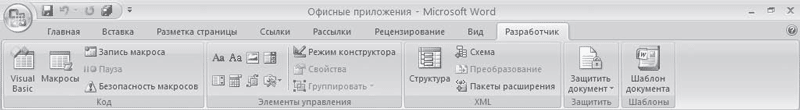 Достаточно часто пользователю приходится повторять те или иные команды в определенной последовательности (например, оформлять текст курсивом, размером 10, гарнитурой шрифта Arial). Чтобы произвести такое небольшое форматирование, может понадобиться достаточно большое количество времени, особенно если таким образом необходимо выделить несколько десятков слов. Получается, что для каждого участка нужно проделывать четыре операции. Можно, конечно, отформатировать только один участок и создать пользовательский стиль, но и это не самый быстрый способ применения оформления. Если вам часто приходится выполнять одни и те же действия, эффективность вашей работы можно заметно увеличить при помощи макросов. Макросы – это небольшие программы на языке Visual Basic. Они могут помочь не только если требуется много раз выполнить сложное форматирование, но и при вставке объектов, печати выделенного текста и в других случаях. Макросы всегда выполняются в активном документе. Действие некоторых макросов зависит от позиции вставки. Другие могут обращаться только к определенному объекту, например к абзацу или выделенному участку текста. В этом случае перед выполнением макроса нужно выбрать этот элемент. Если же макрос не обращается к определенному объекту (например, выполняет команду перехода к следующему окну), его можно выполнить в любое время. Макросы бывают двух типов: внутренние и внешние. Внутренние внедряются непосредственно в документ или шаблон и могут быть выполнены, только если пользователь работает с данным файлом. Если вы создали макрос для шаблона Normal, его можно будет выполнять только для документов, созданных на основе этого шаблона. Преимущество таких макросов в том, что они вместе с документом перемещаются по жесткому диску, а также с компьютера на компьютер. Внешний макрос можно применять в документах, созданных на основе разных шаблонов. Если вы пользуетесь большим количеством шаблонов, вносить в каждый из них макрос будет неудобно, так как придется делать при использовании внутреннего макроса. Внешний же макрос можно применять для работы с любыми документами, а также свободно переносить с компьютера на компьютер. Для создания внешнего макроса его нужно сохранить с расширением BAS. Инструменты для работы с макросами находятся на вкладке Разработчик ленты, которая по умолчанию скрыта. Чтобы отобразить эту вкладку, нажмите кнопку Office, щелкните на кнопке Параметры Word, в открывшемся окне перейдите в раздел Основные и установите флажок Показывать вкладку «Разработчик» на ленте. В результате на ленте появится вкладка Разработчик (рис. 9.1).