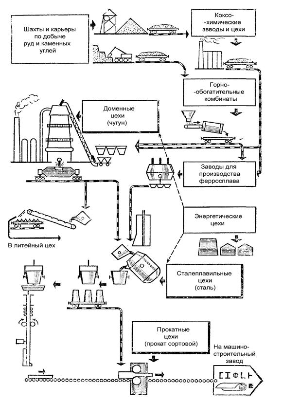 Современное металлургическое производство представляет собой сложный комплекс различных производств, расположенный, как правило, вблизи месторождений руд, коксующихся углей, энергетических мощностей. Оно включает следующие комбинаты, заводы, цехи (рис. 1): 1) шахты и карьеры по добыче руд и каменны углей; 2) горно-обогатительные комбинаты, где подготовляют руды к плавке, т.е. обогащают их; 3) фабрики окускования железорудного сырья (агломерат, окатыши); 4) коксохимические заводы или цехи, где осуществляют подготовку углей, их коксование и извлечение из них полезных химических продуктов: 5) энергетические цехи для получения сжатого воздуха (для дутья доменных печей), кислорода, а также очистки газов металлургических производств;