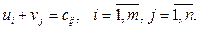 Получим систему уравнений относительно чисел ui и vj, называемых потенциалами. Эта система имеет m + n -1 уравнений с m + n переменными. Так как число уравнений меньше числа переменных, то система является неопределенной и имеет бесконечное число решений. Поэтому полагаем u1 = 0; 2) расчет оценок свободных ячеек. Для ячеек, не занятых объемами перевозок (свободные ячейки), считаем оценки: