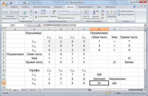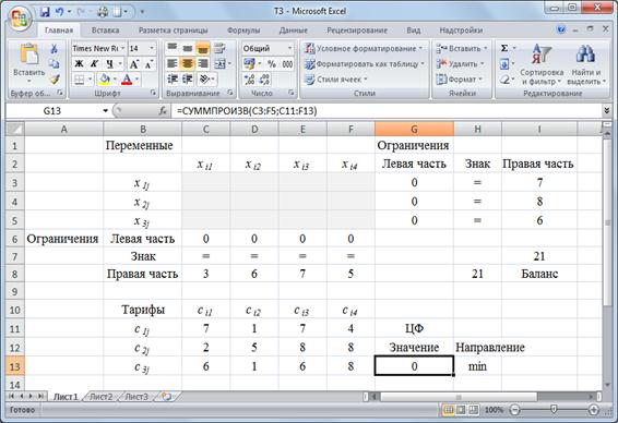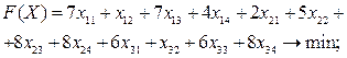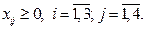 Решение. Обозначим через хij количество груза, перевозимого из пункта i в пункт j, где Балансовое равенство выполняется (суммарная потребность в грузе равняется суммарным запасам: 7 + 8 + 6 = 3 + 6 + 7 + 5), значит, транспортная задача - закрытая. Тогда экономико-математическая модель задачи выглядит следующим образом: