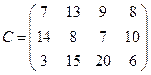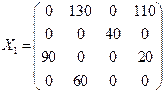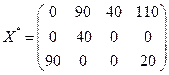 После введения фиктивного поставщика (потребителя) открытая транспортная задача становится закрытой и решается по рассмотренному алгоритму для закрытых транспортных задач, причем тариф, соответствующий фиктивному поставщику (потребителю), принимается больше или равным максимальному из всех транспортных тарифов, иногда его считают равным нулю. В значении целевой функции фиктивный поставщик (потребитель) не учитывается. Пример 2. Составить оптимальный план перевозки грузов от трех поставщиков с грузами 240, 40, 110 т к четырем потребителям с запросами 90, 190, 40 и 130 т. Стоимость перевозок единицы груза от каждого поставщика к каждому потребителю сij задана матрицей