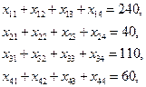 Решение. Равенство (3.3) не выполняется, поэтому задача открытая, так как суммарная потребность в грузе превышает суммарный запас на 60 т. Для решения этой задачи вводим фиктивного поставщика с запасом груза 60 т. Модель задачи запишется следующим образом: хij - количество груза, перевозимого из пункта i в пункт j, где