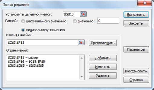 Рисунок 3.2 – Ограничения Требование целочисленности ($C$3:$F$5=целое) задается, если это требуется по условию задачи.