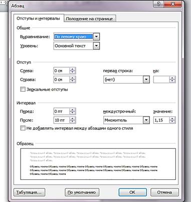 Рисунок 6 – Диалоговое окно Абзац. Следует обратить внимание на две важные особенности выполнения этой операции: – выравнивание абзаца ведется не относительно полей страницы, а относительно установленных отступов абзаца; – для применения разных типов выравнивания текста в границах одной строки нужно использовать табуляторы. Расстояние между строками текста внутри абзаца определяет межстрочный интервал. Избранный межстрочный интервал применяется ко всем строкам текущего абзаца или группы выделенных абзацев. По умолчанию в документе употребляется одинарный интервал, величина которого незначительно превышает высоту символов наибольшего шрифта строки. Конкретная величина этого увеличения зависит от используемого шрифта. Межстрочный интервал устанавливается на вкладке Отступы и интервалы диалогового окна Абзац с помощью раскрывающегося списка Межстрочный. В списке присутствуют варианты: Одинарный, Полуторный, Двойной, Минимум, Точно, Множитель. Вариант Минимум устанавливает минимальный интервал автоматически при вставке в абзац шрифтов больших размеров или графических изображений. При этом редактор автоматически подбирает величину интервала, чтобы вставленные объекты могли разместиться в строке полностью (без обрезания по вертикали). Вариант Точно задает фиксированный интервал, не зависящий от вида шрифта. При этом все строки абзаца будут иметь одинаковую высоту. Вариант Множитель задает коэффициент увеличения/уменьшения одинарного интервала. По умолчанию он принимается равным трем. При выборе последних трех вариантов необходимо в поле счетчика, расположенного по правую сторону, указать значение, с помощью которого будет вычислен межстрочный интервал. Межстрочный интервал можно установить с помощью клавиш быстрого доступа: Ctrl+1 –одинарный; Ctrl+2 –двойной; Ctrl+5 –полуторный; Ctrl+0 –прибавить или удалить одну пустую строку перед абзацем. Чтение и восприятие документа облегчается, если интервал между абзацами немного превышает интервал между строками внутри абзаца. Word разрешает регулировать расстояние между абзацами с точностью до десятых единиц пункта, причем установка интервалов перед абзацем и после него ведется по отдельности. В окне Абзац на вкладке Отступы и интервалы есть поле Интервал, в котором с помощью полей перед и после можно установить соответствующий интервал для выделенного абзаца. Интервалы перед и после являются неотделимыми от абзаца элементами его формата. При копировании абзаца все связанные с ним значения интервалов будут сохранены. Интервалы не изменяются и при изменении размера шрифта в абзаце. Так же Отступ и Интервал можно задать на вкладке Разметка страницы в группе Абзац. С помощью вкладки Положение на странице диалогового окна Абзац можно работать с другими атрибутами. Их перечень представлен в Таблице1. Таблица 1.