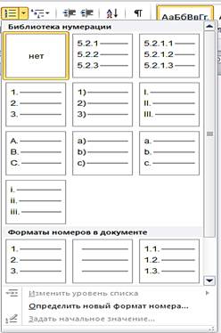 Рисунок 9 – Команда Нумерация группы Абзац. Чтобы разорвать нумерованный список на два отдельных, следует установить текстовый курсор в точку разрыва, нажать клавишу Enter два раза, поместить курсор во второй список, а потом нажав правой кнопкой мыши выбрать пункт Начать заново с 1, либо же Задать начальное значение. Нумерация элементов во втором списке будет автоматически изменена.