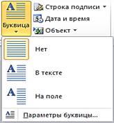 Рисунок 12 - Команда Многоуровневый список группы Абзац и диалоговое окно Определение нового многоуровневого списка. Номера или маркеры абзацев в многоуровневых списках Word расставляет автоматически, но пользователь должен обязательно указывать уровень вложенности каждого абзаца, иначе редактор не сможет правильно сформировать номер и отступ. Работа с буквицами Если нужно начать абзац с большой заглавной буквы (Буквицы) следует выполнить следующие действия: 1. Щелкните на абзац, который должен содержать текст. 2. На вкладке Вставка в группе Текст выберите команду Буквица. 3. Выберите параметр В тексте или На поле (рис 13). 4. Задайте другие параметры.