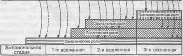 Страх Регрессия Рис. 11 Уже в этом примере из раннего детского возраста мы видим, как человеческое развитие, представленное в форме ролевого развития, осуществляется между доверием и его потерей, то есть в силовом поле между страхом и смелостью. Человеческое развитие — это постоянная прогрессия от соматических ролей, имеющихся уже к концу эмбриональной стадии — растущего, дрыгающего ногами, — к трансцендентным ролям. В ходе нормального развития на каждой стадии добавляются новые роли, тогда как отдельные уже существующие роли теряют свое значение или же исчезают вовсе. Однако большая часть ролевого репертуара все же сохраняется или же на более или менее длительное время переходит в скрытое состояние, например роль школьника в отличие от роли учащегося. Исключение составляют четко ограниченные во времени соматические роли, такие, как роль человека, у которого режутся зубы, роль менструирующей, роженицы, больного и т.д., равно как и ограниченные во времени ролевые кластеры (96), объединяющие различные роли в роли более высокого порядка, например в роли ребенка. Важные соматические роли, такие, как роль дышащего, принимающего пищу и т.д., с рождения до самой смерти являются базальными жизненными ролями. Также и на психическом ролевом уровне ролевое поведение, освоенное в раннем возрасте, не сходит на нет при актуализации социальных и трансцендентно-интегративных ролей, а может только варьировать. В социальных ролях особенно четко проявляются фазы подъема, кульминации, спада и угасания. Их поворотные пункты, так же как и поворотные пункты соматических ролей, часто сопряжены с кризисами, которые могут вести к психическим расстройствам. Ролевое развитие можно представить следующим образом: