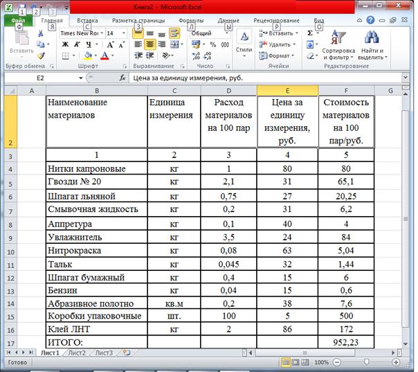 Списки позволяют эффективно работать с большими упорядоченными наборами данных, имеющих одинаковую структуру. Например, основу экзаменационной ведомости составляет список группы, списком является телефонный справочник, в котором в большом количестве строк приведены фамилии абонентов и номера их телефонов. Каждый элемент списка занимает одну строку, в которой данные распределяются по нескольким полям (столбцам). В табличном процессоре имеются операции для их обработки (сортировка, фильтрация). В первой строке списка обычно помещаются названия полей. Эта строка может использоваться в качестве строки заголовков списка, при этом операции фильтрации и сортировки данных к заголовку не применяются. При выполнении операций автоматической фильтрации и сортировки программа самостоятельно пытается определить диапазон данных, который может использоваться в качестве списка. Поэтому каждый новый список желательно создавать на отдельном рабочем листе. При необходимости, фильтрация и сортировка может осуществляться в пределах выделенной (указанной) части диапазона. Диалоговое окно Сортировка данных открывается командой меню ДАННЫЕ ► СОРТИРОВКА. В окне указываются поля, по значениям которых следует упорядочить записи (например, сначала по фамилии, затем по имени), и направление сортировки (по возрастанию или по убыванию). Для автоматической фильтрации данных следует выделить заголовки списка и выполнить команду меню ДАННЫЕ ► ФИЛЬТР ► АВТОФИЛЬТР. После этого в таблице рядом с названиями полей появятся пиктограммы со стрелками – раскрывающиеся списки. Щелчок по одной из этих стрелок выводит меню с перечнем значений данного поля. Выбор какого-либо пункта из этого перечня задаёт условие отбора. После чего в списке отобразятся только те строки (записи), у которых значение данного поля совпадает с выбранным значением, т.е. произойдет фильтрация данных. При этом пиктограмма со стрелкой будет изображена другим цветом или знаком. Если необходимо вернуться к полному списку, то нужно выбрать опцию ВСЕ в перечне значений поля, по которому выполнялась фильтрация. Здесь же есть опция УСЛОВИЕ, позволяющая задать числовое условие фильтрации. Например, выбрать все записи, значение поля у которых больше заданного, и т.п. Отключение фильтра выполняется той же командой меню, что и включение. Расширенный фильтр позволяет задавать диапазон фильтрации, указывать диапазон условий отбора и копировать полученные результаты в новое место. На рисунке 7.1 приведен пример электронной таблицы, созданной при помощи Microsoft Office Excel. В ячейках Е4¸Е19 рассчитывается стоимость материалов на 100 пар обуви путем умножения данных в ячейках С4¸С19 на данные в ячейках D4¸D19. В ячейках Е4¸Е19 записаны формулы: Е4*D4, Е5*D5, … Е19*D19 хотя на экране дается уже результат вычисления. В ячейке Е20 вычисляется итог путем суммирования данных в ячейках Е4¸Е19. В ячейке записана формула суммы. После того, как таблица готова, можно менять в ней данные, а произведения и сумма будет рассчитываться, и изменяться автоматически.