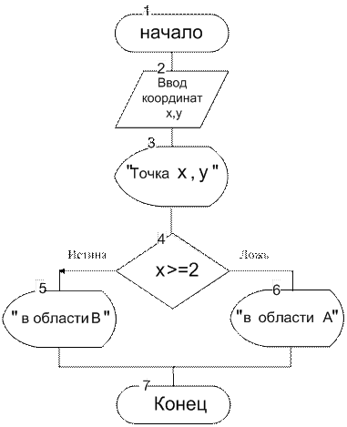 В отличие от линейных алгоритмов, в которых команды выполняются последовательно одна за другой, в разветвляющиеся алгоритмы входит условие, в зависимости от выполнения или невыполнения которого выполняется та или иная последовательность операций, групп операций или базовая управляющая структура. Каждая такая последовательность действий называется ветвью алгоритма. Таким образом, алгоритм ветвящейся структуры содержит только структуры «Следование» и «Ветвление» (рис. 9.2, 9.3 и 9.4). Структура «Ветвление» описывает следующий процесс: если B – ИСТИНА (TRUE) (не равно нулю), то выполняется структура S 1; если B – ЛОЖЬ (FALSE) – структура S 2. При этом происходит разветвление алгоритма (рис. 9.3). Следует иметь в виду, что, хотя на схеме алгоритма должны быть показаны все возможные направления вычислений в зависимости от выполнения определённого условия (или условий), при однократном прохождении программы процесс реализуется только по одной ветви, а остальные исключаются. Любая ветвь, по которой осуществляются вычисления, должна приводить к завершению вычислительного процесса. Пример. Рассмотрим пример ветвящегося вычислительного процесса. Определить и вывести на экран монитора сведения о положении точки (Х, Y) в указанной области (рис. 9.10). Координаты точки вводятся с клавиатуры по запросу пользователя. Примечание: прямая, уравнение которой х = 2 принадлежит области В.
