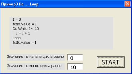 Результат выполнения программного кода цикла с предусловием с использованием универсального оператора цикла DO … LOOP представлен на рисунке 11.5. Фрагмент программного кода данного примера отображается на форме внутри элемента управления типа Label (метка).