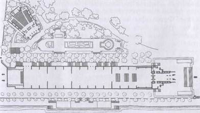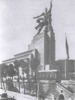 Советский павильон на всемирной выставке в Париже. Архитектор Б.Иофан, скульптор В.Мухина, 1937 В 30-е гг. нужна была новая, иная, чем в 20-е, архитектура -непременно монументальная, чтобы средствами еще более внушительными, чем в прежние эпохи, запечатлеть величие новой действительности; непременно яркая, сразу же запоминающаяся, в каком-то смысле даже агитационно-пропагандистская, плакатная. Именно такую архитектуру и сумел предложить Б.Иофан [15, С.99]. В органическом слиянии скульптуры и архитектуры Б.Иофаном был создан шедевр синтетического искусства. Динамически устремленный вперед и ввысь павильон и его венчающая группа "Рабочий и Колхозница" В.Мухиной, выполненная из нового материала - нержавеющей стали, составляли одно гармоническое целое. Эта композиция стала своеобразным художественным гербом страны Советов, олицетворением его новой классовой сущности, неудержимости движения великого народа к светлому будущему [12, С.44].