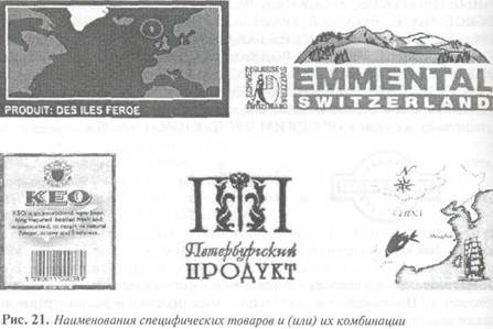 Рис. 20. Знак «Русский продукт» Информирование о происхождении товара в форме классического «Сделано / Изготовлено / Произведено в...» является самым простым и распространенным, но также может выражаться в форме знаков и часто в комбинации с наименованиями компаний — производителей товаров, их производственного профиля и (или) элементами соответствующей национальной и государственной символики, народных мотивов, иногда и того и другого вместе взятых. Стилизованное изображение (цвета) национального флага и других государственных символов часто используется в маркировке отечественной и зарубежной продукции, и кажется довольно естественным в данном применении. При этом необходимо помнить, что зачастую государственная и региональная (местная символика) защищена законодательно и ее коммерческое использование, как правило, регулируется установленными правилами и может предусматривать за такое применение определенную плату. Государственный флаг Российской Федерации, его описание и порядок официального использования устанавливаются Федеральным конституционным законом. Использование Государственного флага Российской Федерации с нарушением настоящего Федерального конституционного закона, а также надругательство над Государственным флагом Российской Федерации влекут за собой ответственность в соответствии с законодательством Российской Федерации. Для выделения определенного товара из массы присутствующих на рынке путем привлечения внимания к месту производства служит наименование продукции, предприятия-изготовителя (в форме товарного знака), включающее наименование области или населенного пункта по месту его расположения. При этом могут использоваться местная (региональная) символика, географические образы (например, географические названия и фрагменты карт), наименования специфических товаров и (или) их комбинации (рис. 21.).