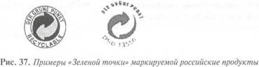 Рис. 36. «Зеленая точка» Осенью 1990 г., после того как Министерство окружающей среды ФРГ выступило с проектом Декрета об упаковке (и отходов от нее), около 100 компаний из сфер розничной торговли, производства потребительских товаров и упаковки объединились, чтобы основать специализированную компанию для решения проблем, связанных с требованиями упомянутого Декрета, а также со сбором и утилизацией бытовых отходов от упаковки посредством их вторичной переработки. Финансовая основа этой системы — продажа права маркирования утилизируемой в ее рамках упаковки специальным знаком «Зеленая точка». Этот знак означает, что: 1)соответствующая промышленность или компания дает гарантию приема и вторичной переработки маркированного упаковочного материала; 2)производитель или продавец маркированного товара подписали с компанией контракт на использование знака «Зеленая точка» и оплачивают соответствующий лицензионный сбор; 3)после использования маркированная знаком упаковка является собственностью одной из организаций, действующих в рамках «Дуальной системы». На практике расходы на маркировку этим знаком (т. е. в принципе на утилизацию использованной упаковки), скорее всего входят в конечную стоимость товара и таким образом перекладываются на плечи рядовых потребителей. Как правило, контракт на право использования знака «Зеленая точка» заключается с изготовителем товаров, но иногда он может быть заключен и с торговой организацией. При этом учитываются только определенные виды упаковочных материалов — те, на которые существует гарантия вторичной переработки. В настоящее время «Зеленая точка» используется в ФРГ, Франции, Бельгии, Ирландии, Люксембурге, Австрии, Испании и Португалии. Имеются также данные о намерении других европейских стран внедрить у себя подобную систему, обсуждение связанных с этим вопросов происходит и в России. Так что победное шествие «Зеленой точки» по Европе продолжается. При этом на упаковках товаров в России иногда встречаются комбинированные знаки, включающие изображение «Зеленой точки» с соответствующими буквенными и цифровыми обозначениями, прочими знаками (рис. 37.), а иногда ее даже объединяют с заявлениями