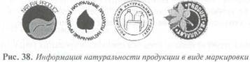 Информация о натуральности продукции (используемых сырья и процессов изготовления), например продукты, полученные натуральными способами, к примеру, выращенные без применения химикатов, произведенные без искусственных пищевых добавок, что, как правило, отражается при рекламе этих продуктов, в том числе в виде маркировки на упаковке (рис. 38.).