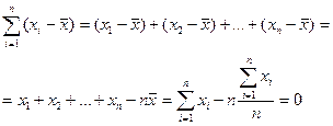 Средняя арифметическая величина может быть дробным числом, если даже индивидуальные значения признака могут принимать только целые значения (дискретный признак). Ничего «предосудительного» для метода средних в этом не заключено; из сущности средней не вытекает, что она обязана быть реальным значением признака, которое могло бы встретиться у какой-либо единицы совокупности. Если при группировке значения осредняемого признака заданы интервалами, то при расчете средней арифметической величины в качестве значения признака в группах принимают середины этих интервалов, т.е. исходят из гипотезы о равномерном распределении единиц совокупности по интервалу значений признака. Для открытых интервалов в первой и последней группе, если таковые есть, значения признака надо определить экспертным путем исходя из сущности, свойств признака и совокупности. Свойства арифметической средней величины Знание некоторых математических свойств средней арифметической полезно как при ее использовании, так и при ее расчете. 1. Сумма отклонений индивидуальных значений признака от его среднего значения равна нулю. Доказательство:
