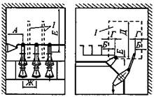 Рис. 4.2.2. Установка разъединителя (отделителя): а - вертикальная; б — наклонная; 1 — изолирующие перегородки