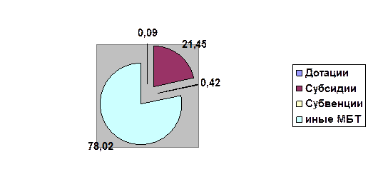 Из представленной диаграммы видно, что основную долю доходов в бюджет Сычево составляют налоговые (51,8%) и безвозмездные поступления (40,9%). Теперь определим долю местных налогов в общих налоговых доходах. Для этого возьмем общую сумму налоговых доходов 69804,2 и местные налоги, в которые входят земельный налог и налог на имущество, и которые вместе составляют общую сумму 57800,00. Их доля будет равна 82,8 %. Дальнейший наш анализ будет проводиться в отношении безвозмездных поступлений, которые составили 40,9 % от общих поступлений. Определим в отношении дотаций, субсидий, субвенций и иных межбюджетных трансфертов долю, которую они составляют в общих безвозмездных поступлениях, и представим в диаграмме (рис. 5):