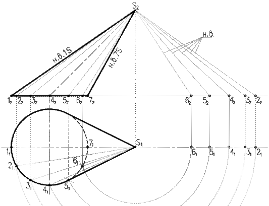 Существуют следующие способы построения разверток развертываемых поверхностей: 1. Способ триангуляции (треугольников); 2. Способ раскатки. Способ триангуляции (треугольников) применяется для построения разверток пирамидальных и конических поверхностей. Они выполняются по одному принципу. Каждая грань пирамиды представляет треугольник и для построения развертки необходимо определить натуральные величины всех сторон треугольника. По найденным натуральным величинам сторон вычерчиваются последовательно треугольные грани. Коническая поверхность, заменяется вписанной в нее, пирамидальной и решение задачи ведется аналогично пирамиде. Рассмотрим пример, построения развертки, конической поверхности (рисунок 4) Для построения развертки в конус вписываем двенадцатигранную пирамиду. Т.к. по условию конус расположен симметрично относительно оси, построим половину развертки. Образующие конуса имеют разную длину, поэтому натуральную величину определяем вращением до положения параллельного фронтальной плоскости проекций. Только образующие S1 и S7, проецируются в натуральную величину. По полученным натуральным величинам образующих и размерам хорд окружности основания, между образующими, строим половину развертки, состоящую из шести треугольников вписанной в конус пирамиды. Точки основания соединяем плавной кривой линией.