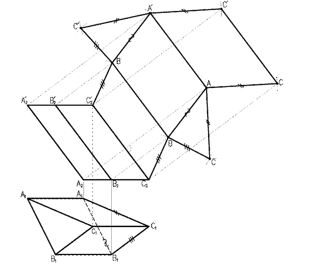 Способ раскатки применяется для построения разверток призматической и цилиндрической поверхности. И если поверхность цилиндрическая, то в нее вписывается призматическая поверхность. Поэтому принцип построения этих разверток одинаков. Рассмотрим пример построения развертки наклонной треугольной призмы (рисунок 5) Развертку можно выполнять только в том случае, если боковые ребра призмы параллельны плоскости проекций, как на рисунке 5. В противном случае, сначала выполняется преобразование (методом замены строится новая проекция на плоскость параллельную ребрам). При выполнении развертки методом раскатки точки А2, В2, С2 перемещаются по перпендикулярам к боковым ребрам призмы. А натуральные величины отрезков СВ, ВА, АС берутся из горизонтальной проекции, т.к. основание призмы параллельно плоскости П1. Боковые ребра остаются на развертке параллельными, т.к. каждая грань призмы является параллелограммом.
