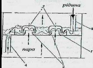 Рис. 11. Схема роботи ковпачкової тарілки: 1-тарілка, 2-газові патрубки, 3-ковпачки, 4-зливні труби.
