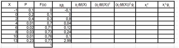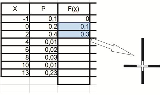 Запускаем OpenOffice и выбираем приложение «Электронная таблица». Открываем файл, соответствующий номеру варианта. Загружается файл с данными. (Можно просто щёлкнуть мышью по файлу, соответствующему номеру варианта). В середине поля электронной таблицы расположены данные по дискретному распределению в Вашем варианте. Фрагмент середины поля электронной таблицы приведён на рис.6.
