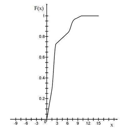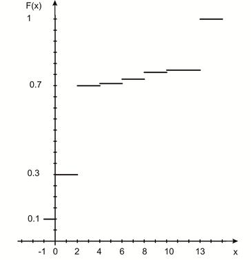 Ниже изобразим график функции распределения дискретной случайной величины, как мы это делали на рис.3. Получившийся график функции распределения в рассматриваемом примере приведён на рисунке 9.