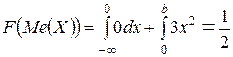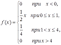 То есть необходимо вычислить интеграл, разбив его также на сумму интегралов по каждому интервалу, подставив в верхний предел последнего суммируемого интеграла неизвестную величину b. В некоторых случаях суммировать интегралы нужно не по всем интервалам, а только до среднего интервала. Это нужно для того, чтобы суммарная площадь под кривой распределения не превысила значение 0,5. Затем, вычислить интегралы и приравнять полученное выражение к 0,5, получить уравнение относительно b. Если полученное уравнение не имеет действительных решений, то необходимо изменить количество суммируемых интегралов. Поскольку рассматриваемый выше пример даёт уравнение, решение которого является трудоёмкой задачей, рассмотрим другие примеры. Пример 1. Пусть задана плотность распределения: