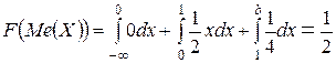 Таким образом, в точке Запишем В некоторых случаях, для нахождения моды непрерывной случайной величины не нужно применять необходимое условие существования экстремума функции, то есть не нужно искать производную и приравнивать её к нулю. Это относится к тем случаям, когда максимум достигается на границе интервала кусочно-заданной функции плотности распределения. Найдём медиану непрерывной случайной величины. Для этого воспользуемся формулой (25):
