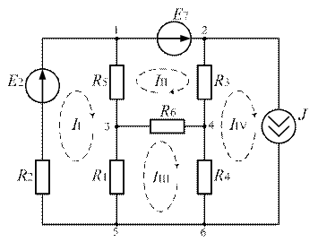 Рис. 3.1. Схема електричного кола Проаналізуємо схему кола та визначимо кількість рівнянь у системі: вузлів Вузли та контури, для яких будуть записуватись рівняння, обираються довільно. Довільно задаються і напрямки струмів у гілках кола та напрямки обходу незалежних контурів (див. рис. 3.1). Отже одержана система із шести рівнянь із шістьма невідомими (струмами):