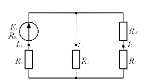 Рис. 3.14. Схема електричного кола В електричному колі діє два джерела енергії, відповідно до принципу суперпозиції необхідно розглянути роботу кола відносно дії кожного джерела окремо, тому розкладаємо задану схему на дві прості (часткові) схеми за кількістю джерел (див. рис. 3.15 та 3.16). Зображаючи часткову схему необхідно пам’ятати, що видалене джерело необхідно замінити його внутрішнім опором. Внутрішній опір ідеального джерела ЕРС дорівнює нулю, який на схемі зображується закороткою; внутрішній опір ідеального джерела струму дорівнює нескінченості і зображується розривом. Виконаємо розрахунок часткових струмів.
