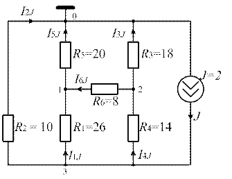 Рис. 3.9. Схема електричного кола Розглянемо методику методу вузлових потенціалів на прикладі кола, зображеного на рис. 3.9. Нехай потенціал 3-го вузла – нуль. Складемо рівняння за першим законом Кірхгофа для 1-го та 2-го вузлів: