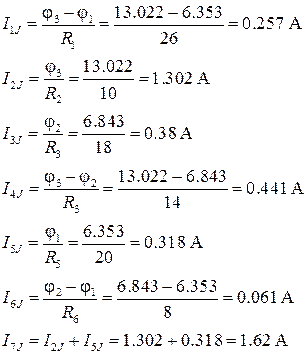 Всі контурні струми додатні – дійсні їх напрямки збігаються з вибраними. Для перевірки вірності розрахунків потрібно підставити знайдені контурні струми у початкові рівняння, при наявності тотожності розв’язок вважається вірним. Реальні струми гілок дорівнюють алгебричним сумам контурних струмів, що протікають у гілках.