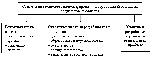 Социальная ответственность в бизнесе может рассматриваться только как добровольная. Социальная ответственность может выступать в виде благотворительной деятельности фирм, участия в разработке и осуществлении социальных программ совместно с государством или другими фирмами, усиления ответственности перед обществом за состояние экологии, здоровья не только своих работников, но и населения в целом, усиления безопасности производства и потребления (эксплуатации) товара, соблюдения гражданских прав, заботы об интересах потребителя (см. схему 16.1).