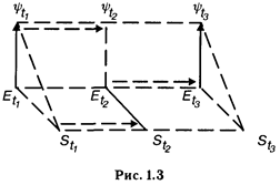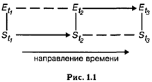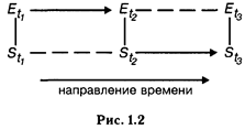 Поскольку мы фиксируем тем или иным способом изменения в среде и в системе, переход системы от состояния в момент t1 к состоянию в момент t3, а среды от состояния t1, к состоянию t2 происходит из-за воздействия системы на среду или среды на систему, а не по какой-либо третьей причине. Если эта третья причина существует, то мы должны включить ее источник или в систему, или в среду. Например, зафиксировав изменение эмоционального состояния человека, мы могли ошибочно приписать его влиянию выполняемого задания. Между тем причиной изменения состояния могло быть негативное отношение к экспериментатору. И следовательно, экспериментатор должен быть включен в качестве составного элемента в описание экспериментальной среды. Переход системы из состояния St1 в состояние St2 — так же, как и переход Еt1 - - - Еt2 — определяется внутренним самодвижением системы и среды. Нетрудно заметить, что рассматривать процесс взаимодействия можно и иначе, а именно взяв за отправную точку состояние системы. Вид графа в этом случае показан на рис. 1.2.