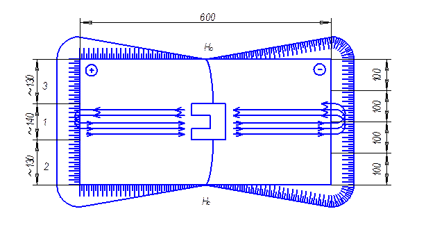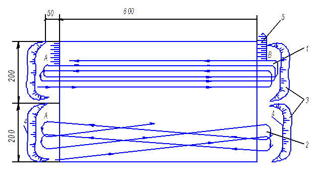 4.3. Выбор технологической схемы производства работ по планировке строительной площадки При выборе и обосновании технологической схемы производства работ по вертикальной планировке строительной площадки следует исходить из необходимости первоочередного представления фронта работ для разработки котлована (траншеи) и характера рельефа местности. Необходимость быстрейшего представления фронта для разработки котлована под сооружение требует определения границ участков первоначального и последующего производства работ на площадке. Так, при относительно спокойном местном рельефе площадки и привязке котлована под сооружение в средней части (рис. 4.3), целесообразно выполнить продольное разделение на три приблизительно равных участка размером 600´130 м. Зная среднюю дальность транспортирования земляных масс, принимаем механизированный комплекс, который для рассматриваемой схемы будет состоять из ведущей машины-скрепера, вспомогательных машин - бульдозера, рыхлителя (в случае разработки глинистых грунтов) и катков для послойного уплотнения насыпи. Как показано на рис. 4.3 скрепер работает по спирали, начиная с 1-го участка. По мере готовности 1 участка скрепер перемещается на 2 участок, представляя фронт работ по разработке котлована. Дальнейшее производство планировочных работ на 2-м и 3-м участках ведется параллельно с разработкой котлована под сооружение. При выполнении планировочных работ при более сложном рельефе (рис. 4.4) возможно деление площадки на два симметричных (равновеликих) участка размером 300´400 м каждый. Для разработки грунта возможно применение 2 технологических схем: скреперными (А) или спаренными (групповыми) бульдозерными комплексами (В). Разработка бульдозерами под уклон позволяет увеличить производительность машины. Так, при уклоне 10% производительность буль-