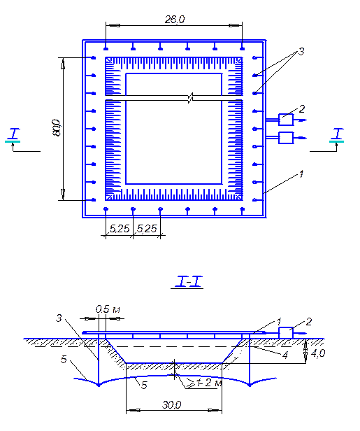 Рис. 4.5 Примерная схема осушения котлована иглофильтровой установкой типа ЛИУ–6: 1 – коллектор; 2 – насосная установка; 3 – иглофильтры; 4 – статический уровень грунтовых вод; 5 – депрессионная кривая (динамический уровень грунтовых вод)