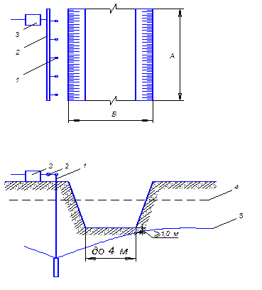 Рис. 4.6 Примерная схема осушения иглофильтровой установкой траншей: 1 – иглофильтр; 2 – коллектор; 3 – насос; 4 – статический уровень грунтовых вод; 5 – депрессионная кривая (динамический уровень грунтовых вод)