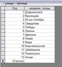 После ввода нажмите на кнопку закрытия текущего окна. Задайте имя таблицы и сохраните ее. Программа предложит задать ключевое поле (по умолчанию создаст сама – счетчик записей). Дважды щелкните по названию таблицы “Улицы”. Появится пустая структура таблицы. Заполните ее.