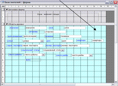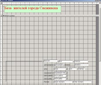 1. Создайте в режиме Мастера форму, добавив из таблицы База жителей все поля. Назовем форму Жители. 2. Откройте форму в режиме Конструктора, и в поле Заголовок формы с помощью надписи введите название: База жителей города Снежинска.
