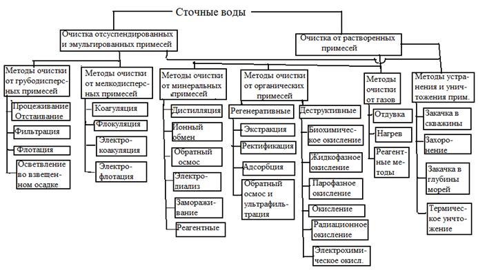Рис.12. Методы очистки сточных вод Сооружения механической очистки сточных вод предназначены для задержания нерастворенных примесей. К ним относятся решетки, песколовки, отстойники, фильтры, гидроциклоны и центрифуги. К методам физико-химической очистки производственных сточных вод относятся: коагуляция и флокуляция, флотация, адсорбция, ионный обмен, экстракция, перегонка, дегазация, кристаллизация и др. На ряде предприятий используются химические, электрохимические и термические методы очистки и обезвреживания сточных вод. Биологическая очистка сточных вод основана на жизнедеятельности микроорганизмов, которые окисляют растворенные и нерастворенные органические соединения, являющиеся для микроорганизмов источниками питания.