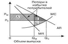 Рис. 9.2. Чистые убытки от монопольной власти На конкурентном рынке цена равна предельным издержкам. Цена Рс и объем продукта с находятся на пересечении кривой среднего дохода и кривой предельных издержек. Посмотрим, как изменится излишек, если с равновесных цены Рс и объема C переместимся к монопольным цене Рм и объему продукта м. В условиях монополии если цена выше, то покупатели приобретают меньше продукта. Те покупатели, которые приобретают товар по более высокой цене, теряют часть излишка (прямоугольник А), а покупатели, которые не могут приобрести товар по цене Рм, но приобрели бы его по цене Рс, тоже теряют излишек (треугольник В). Таким образом, общая потеря потребительского излишка равна А + В. В то же время производитель извлекает прибыль, обозначенную прямоугольником А, реализуя товар по более высокой цене, однако теряет часть излишка, обозначенную треугольником С, представляющую собой дополнительную прибыль, которую производители получают от реализации объема выпуска (c – M) по цене PC. Следовательно, общая прибыль производителя равна А – С. Вычитая потерю потребительского излишка из прибыли производителя, получаем чистые убытки, равные В + С. Это полные чистые убытки от монопольной власти. Общие чистые убытки – это общественные издержки неэффективности из-за более низкого объема производства при монополии в сравнении со свободной конкуренцией. Могут иметь место и дополнительные общественные издержки монопольной власти, которые больше чистых убытков, заключенных в треугольниках В и С. Это затраты на рекламу, создание своего «хобби», юридические попытки избежать государственного контроля над ценами и антитрестовского законодательства и др. Таким образом, чем большая часть излишка переходит от потребителей к монополисту (прямоугольник А), тем больше общественные издержки монополии.